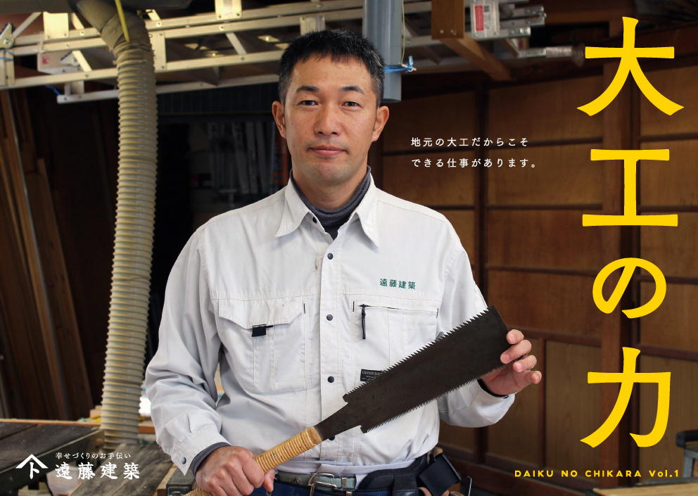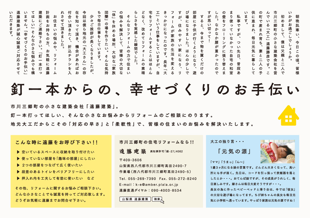 遠藤建築 市川三郷町の頼れる大工遠藤勝彦さんの人柄や大工の腕を伝えるチラシを定期的に作らせていただいています。釘一本でも頼まれればうちに行くよ。遠藤さんの言葉に頼もしさを感じずにいられません。
